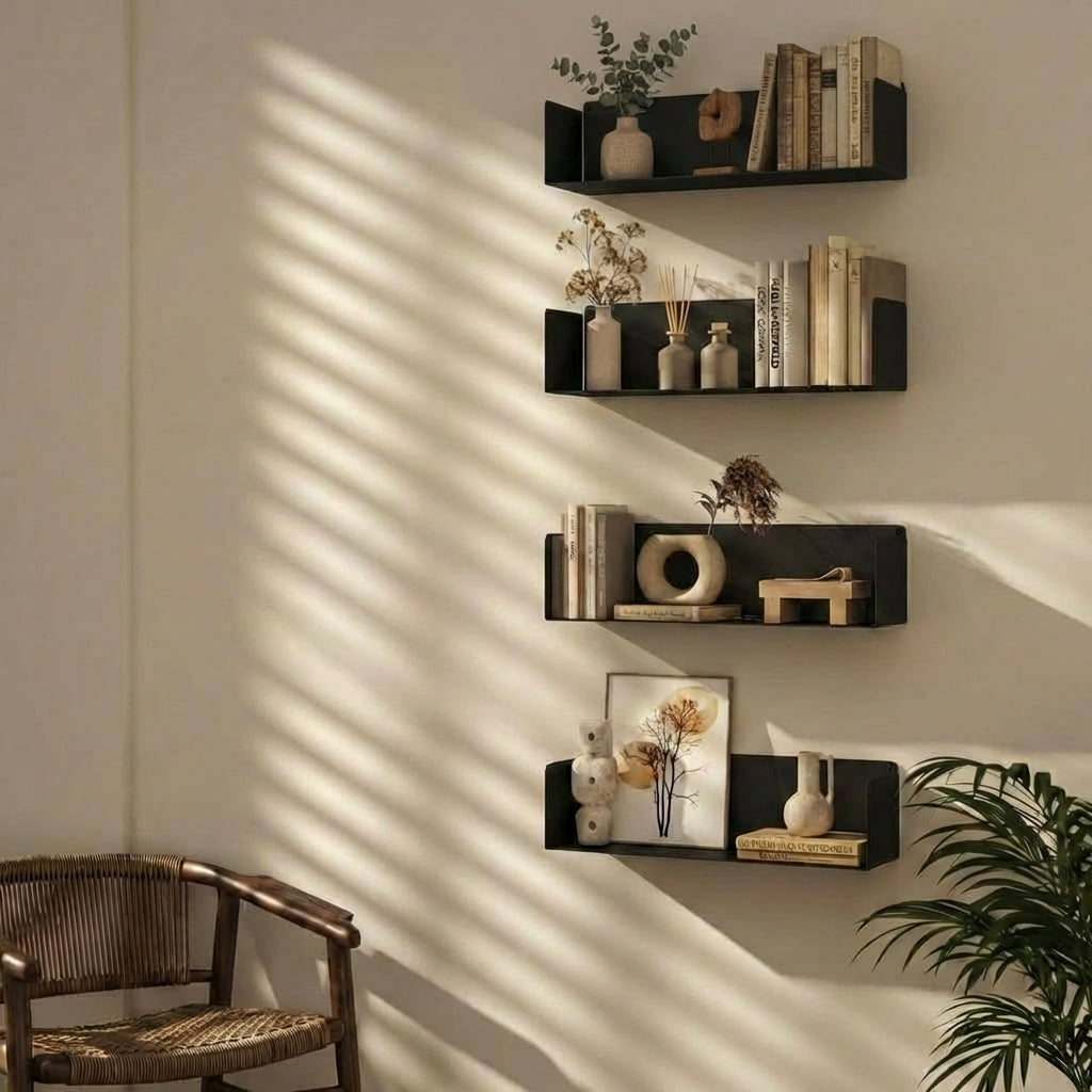 El pack de 4 unidades permite crear composiciones personalizadas en la pared, adaptándose a diferentes alturas y necesidades de almacenaje. Son ideales para instalar en salones, cocinas, dormitorios, recibidores, oficinas o despachos, tanto en hogares como en espacios profesionales.